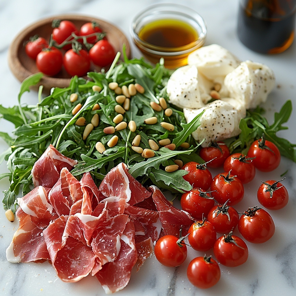 You can prep the ingredients separately ahead of time. Keep arugula, tomatoes, and pine nuts ready, but add burrata and prosciutto last minute to keep everything fresh and vibrant for your guests.