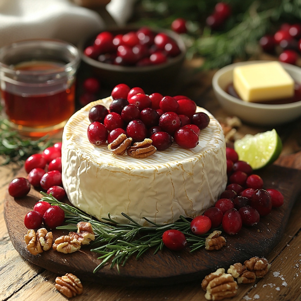 A delicious and elegant appetizer featuring soft, warm baked brie topped with a sweet and tangy cranberry pecan jam. Perfect for holiday gatherings or special occasions, this recipe combines creamy brie with a vibrant cranberry reduction enhanced by maple syrup, fresh rosemary, and toasted pecans.