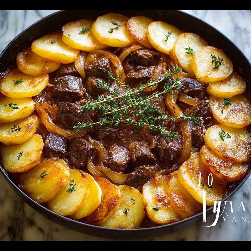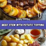 This hearty Beef Stew with Potato Topping is a comforting dish featuring tender, slow-simmered beef in a rich, flavorful broth topped with golden, crispy sliced potatoes. Perfect for a cozy family meal, it combines classic stew ingredients with a delightful baked potato crust for added texture and taste.