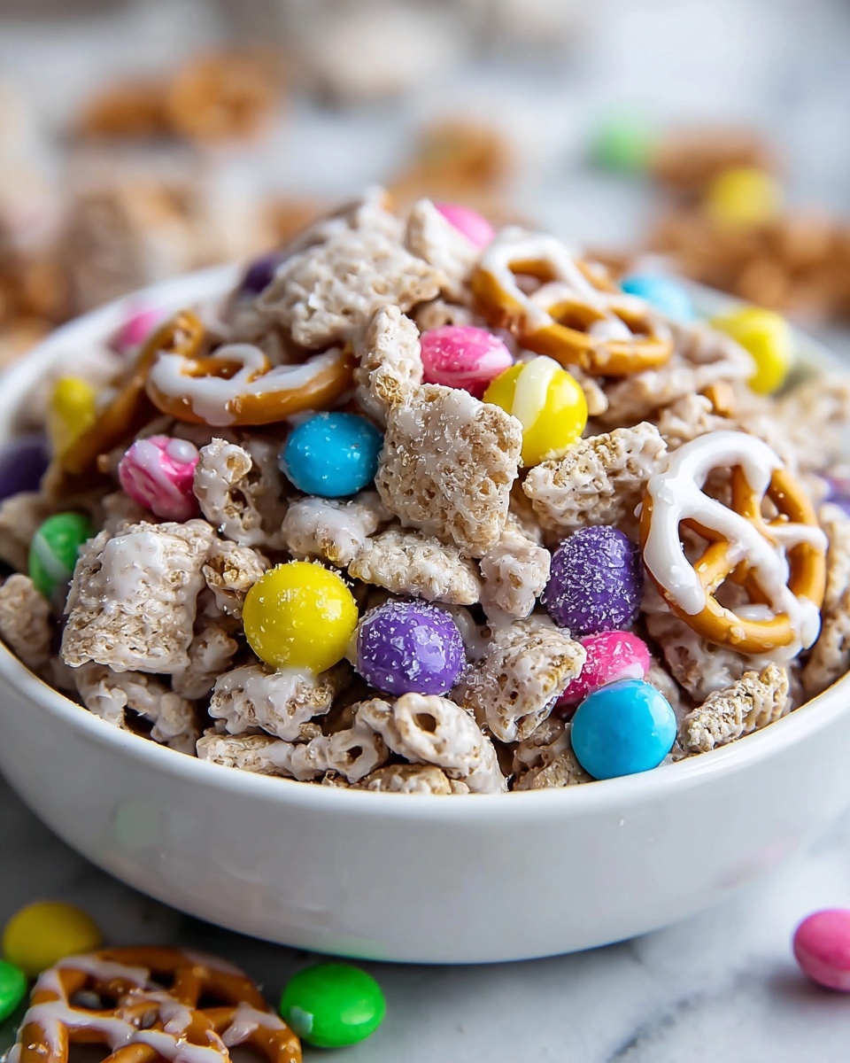 Although the snack mix is already decked out with colorful M&M’s and sprinkles, for a little extra flair, consider topping your serving bowls with fresh edible flowers or a light dusting of powdered sugar to keep that festive Easter vibe alive and irresistible.