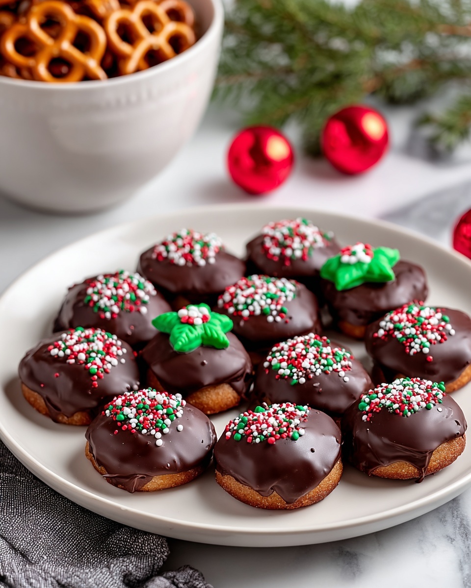 These bites pair beautifully with a warm cup of spiced hot chocolate, creamy eggnog, or even a refreshing glass of milk. Their sweet and salty nature makes them a versatile companion to many holiday drinks and desserts.