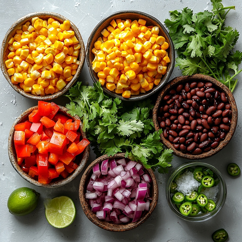 - Combine Ingredients: In a mixing bowl, combine black beans, corn, red bell pepper, jalapeno, red onion, cilantro, lime juice, salt, and black pepper. Mix thoroughly to ensure even flavor distribution.
