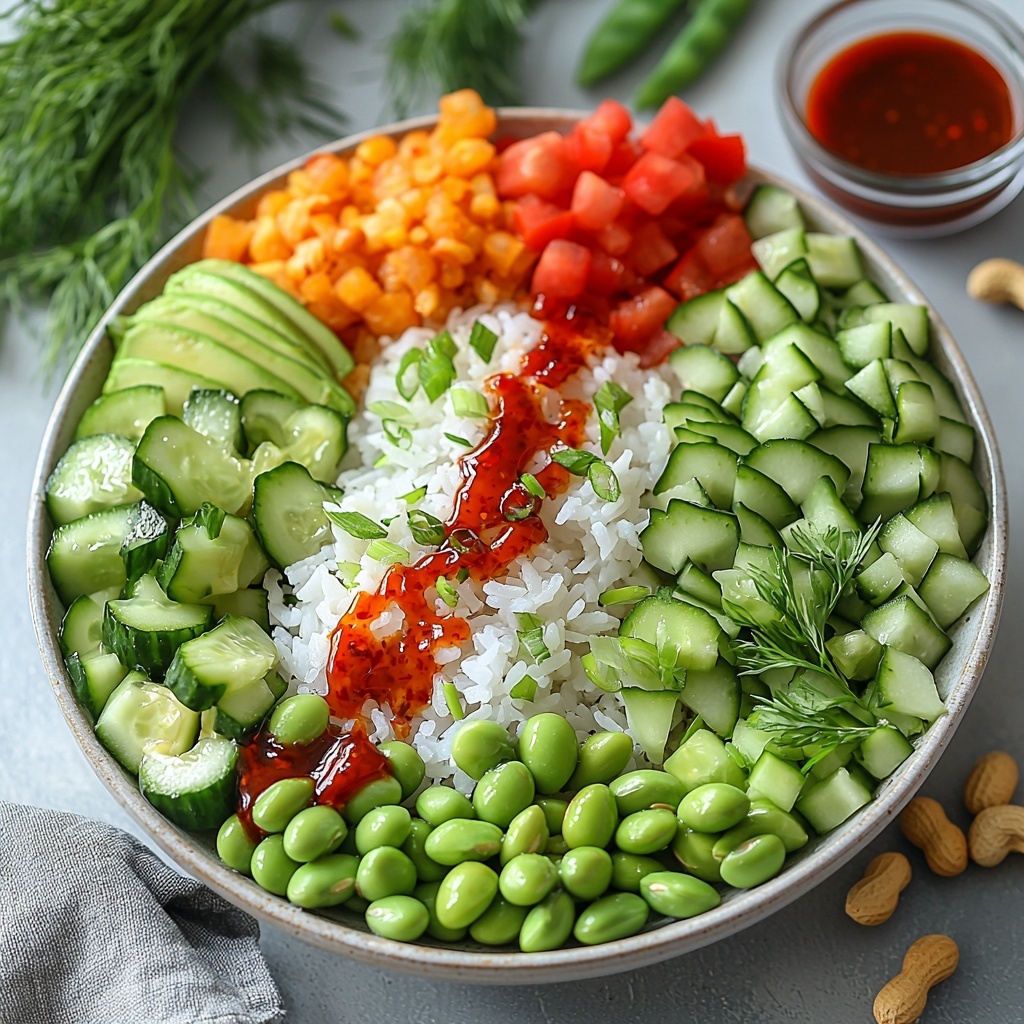 Start by tossing together the edamame, diced avocado, cucumber, bell pepper, spring onions, coriander, and dill in a large mixing bowl. This combination sets the stage for fresh, vibrant flavors and a wonderful array of textures that will make each bite exciting and satisfying.