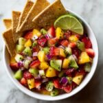 A refreshing and colorful fruit salsa featuring strawberries, kiwi, mango, and pineapple combined with a hint of red onion, lime juice, and honey, paired perfectly with warm, crispy cinnamon sugar tortilla chips baked to golden perfection. This easy no-fuss recipe offers a delightful balance of sweet, tangy, and spicy flavors, making it a perfect appetizer or snack.