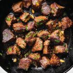 4. Finish: Return the seared steak bites to the skillet with the garlic butter and toss well to coat each piece evenly with the flavorful sauce. Serve immediately, garnished with chopped parsley if desired, to add a fresh, vibrant touch.