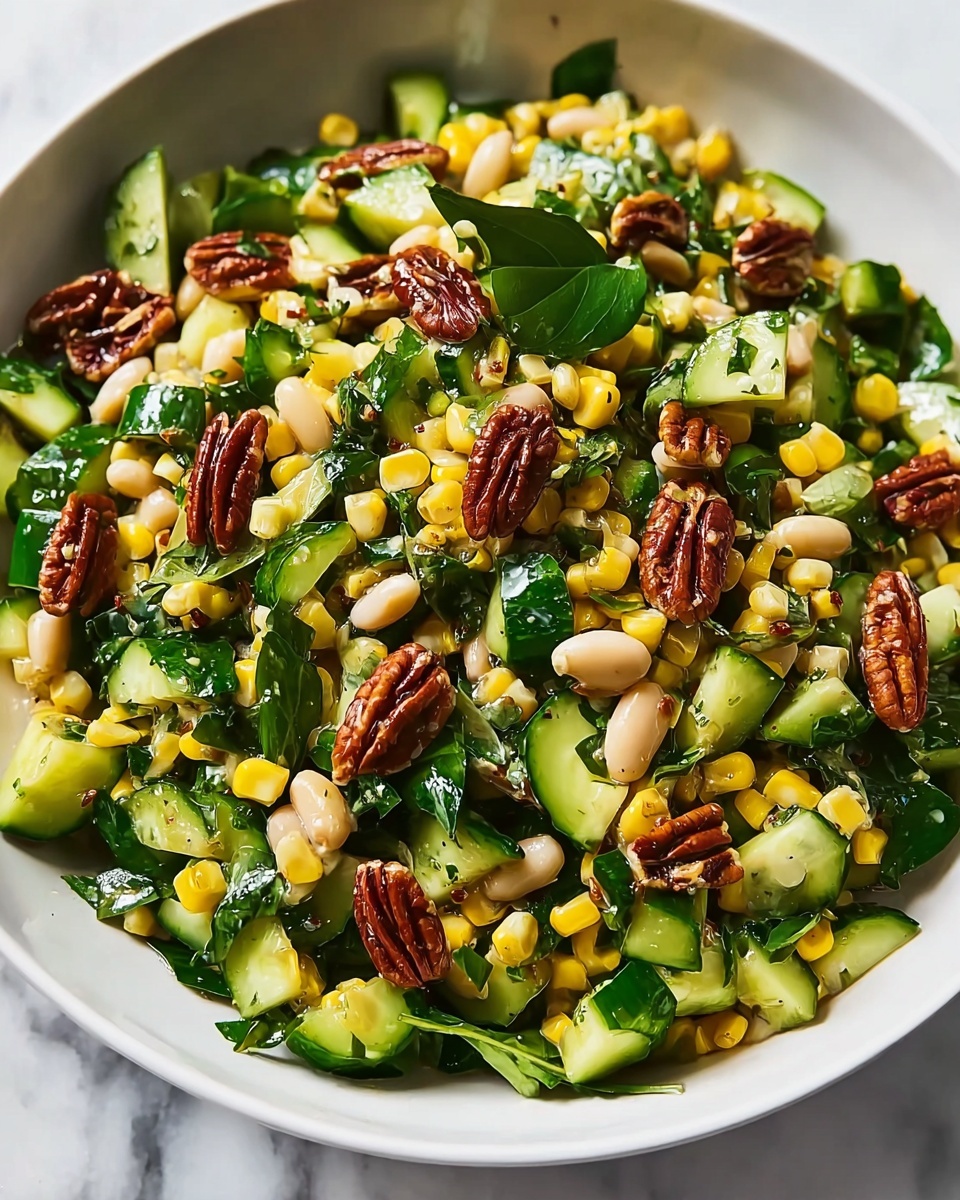 Once grilled, dice the zucchini into bite-sized pieces and slice the corn kernels off the cob. Add both to the bean mixture along with torn basil leaves and chopped pecans. Toss gently to combine, letting all the flavors mingle.