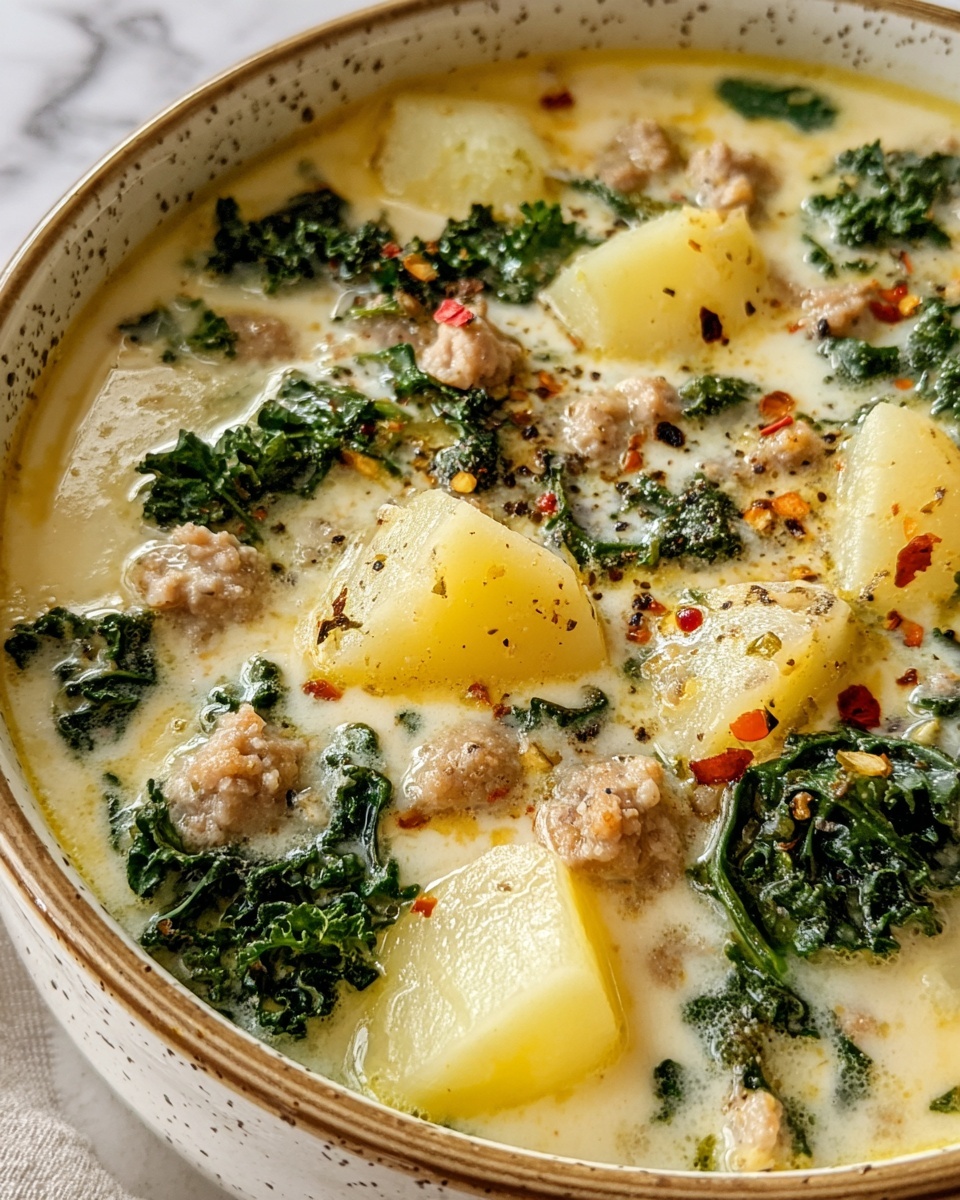 For something fun, try serving the soup inside a hollowed-out bread bowl. It’s rustic, appealing, and makes your Homemade Zuppa Toscana Soup Recipe feel even more comforting and indulgent. Another idea is to top individual servings with a swirl of pesto or a sprinkle of chili flakes, offering guests the chance to customize their bowls.