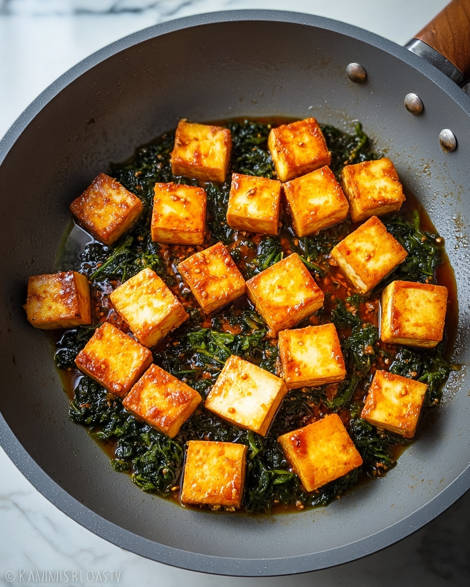 Add the blanched spinach to the skillet, followed by coriander powder, turmeric, salt, and pepper. Mix everything together and cook for about five minutes, allowing the spices to meld with the greens imparting earthiness and warmth into every bite.