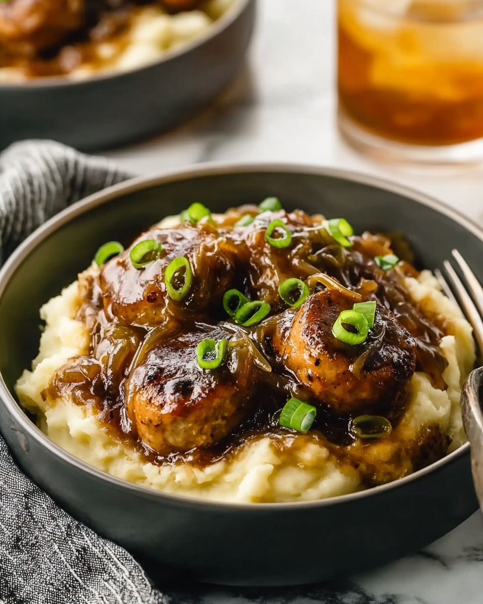 Now comes the fun part — plating! Spoon a generous mound of the creamy mashed potatoes onto each plate. Arrange the sausages on top, and then pour the fragrant onion gravy all over. This layering ensures every spoonful hits you with that classic combo of soft potatoes, meaty sausages, and savory gravy. Serve immediately while everything is piping hot and enjoy the ultimate comfort food experience.