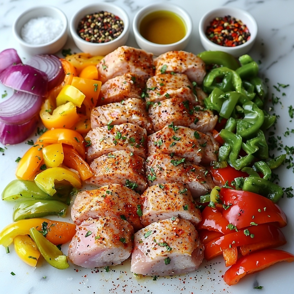 Start by slicing your chicken breast into thin strips—this ensures quick cooking and maximum flavor absorption. Slice the bell peppers and onions into similar-sized strips so everything cooks evenly. When all your ingredients are prepped, the magic of sheet-pan cooking happens effortlessly.