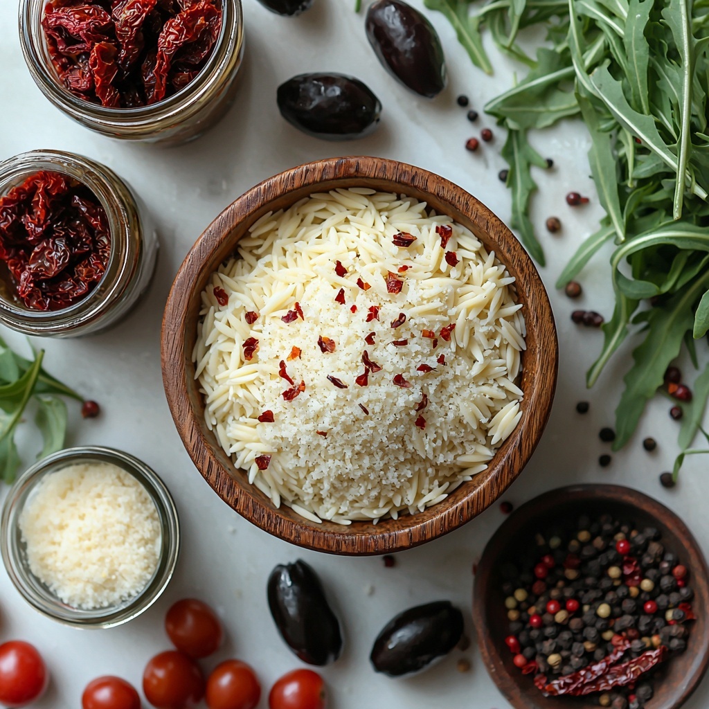 Gathering simple, fresh, and essential ingredients is the key to making this salad shine. Each component plays its role: the orzo provides a hearty base, the olives and sun-dried tomatoes add bursts of flavor, and the dressing brings it all together with a creamy, tangy punch.