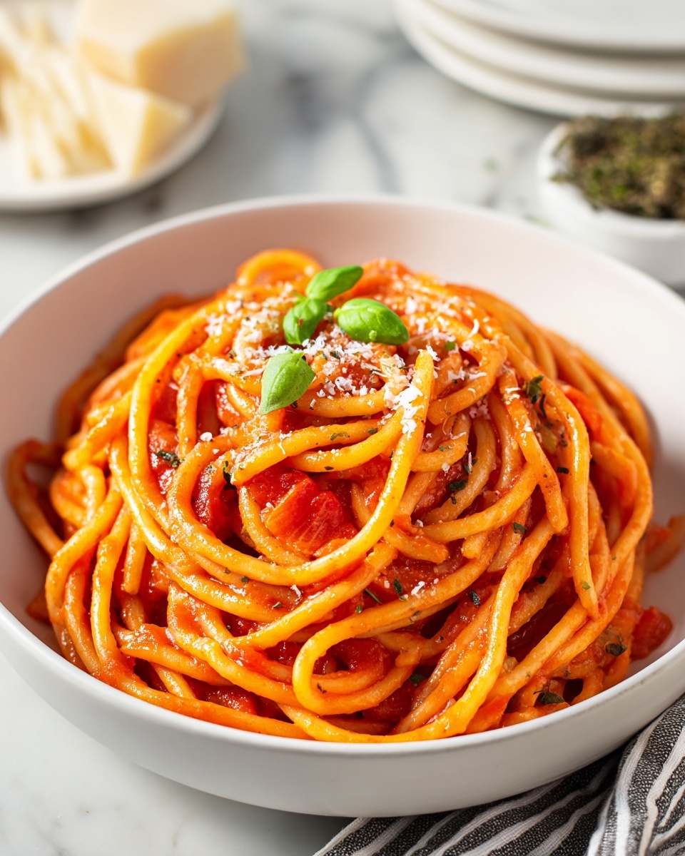 Just before you finish cooking, stir in the torn basil leaves. Basil adds a lively freshness that lightens the sauce beautifully. Because basil’s flavor is delicate, adding it at the end preserves its vibrant aroma and bright green color, which also makes your sauce look as good as it tastes.