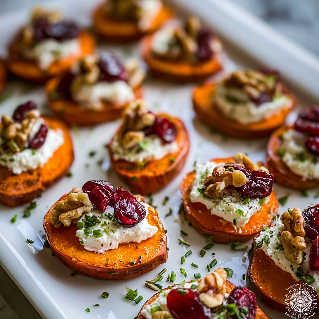 These Roasted Sweet Potato Rounds with Herbed Ricotta, Walnuts, and Cranberries are a delightful appetizer or side dish. Sweet potato slices are roasted to tender perfection, then topped with a creamy mixture of ricotta and fresh herbs, crunchy toasted walnuts, tart cranberries, and a drizzle of honey and optional balsamic glaze for a perfect balance of flavors and textures.