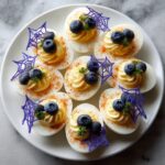 Spider Web Deviled Eggs are a creative and visually stunning twist on classic deviled eggs, featuring a natural blue-purple marbled shell effect achieved by using blueberry or red cabbage natural dye. The eggs are hard-boiled, gently cracked to create a spider web pattern, dyed overnight, and then filled with a creamy, tangy yolk mixture seasoned with mayonnaise, Dijon mustard, vinegar, and spices. This recipe makes an elegant appetizer perfect for Halloween or any festive occasion.