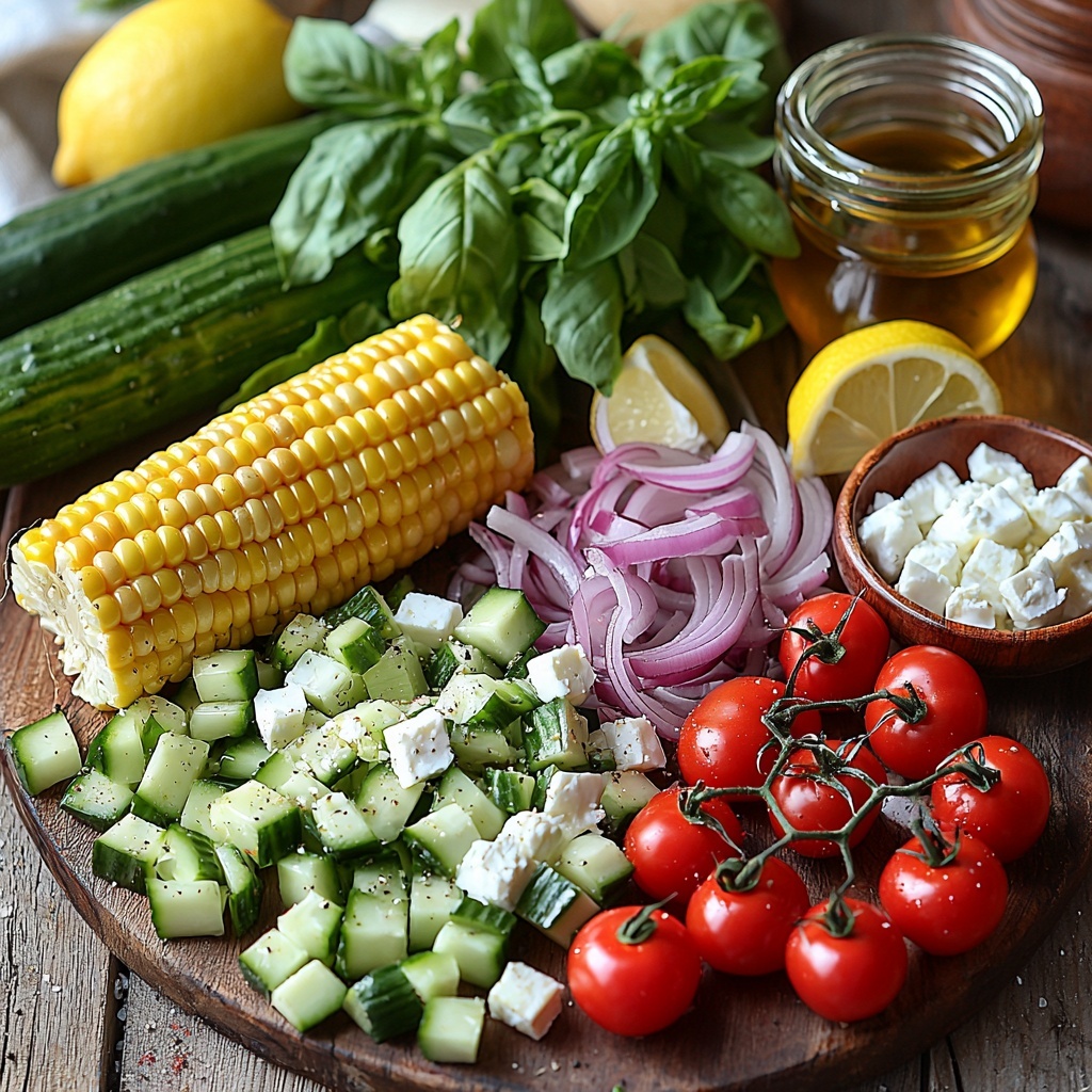 - Combine salad ingredients: In a large bowl, add the fresh corn kernels, diced cucumber, finely chopped red onion, halved cherry tomatoes, and crumbled feta cheese. Mix gently to distribute ingredients evenly.