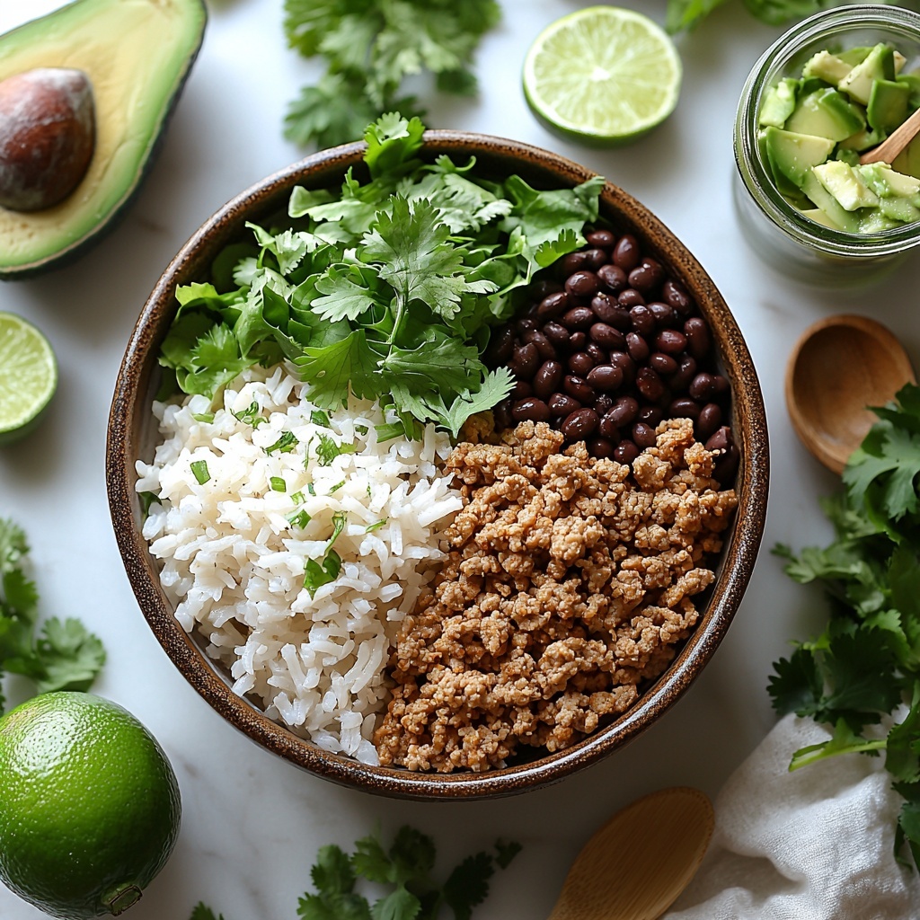 - Assemble the bowls: Start with a generous scoop of the cilantro lime rice as the base in each bowl. Top with the seasoned turkey filling, followed by chopped romaine lettuce, black beans, and slices of fresh avocado. Add any preferred garnishes or extra lime juice before serving.