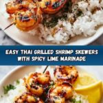 This vibrant Thai Grilled Shrimp recipe offers a perfect balance of sweet, spicy, and tangy flavors with a zesty marinade of lime juice, brown sugar, Sriracha, garlic, and Thai chile. Quickly marinated and grilled to juicy perfection, these shrimp skewers make a fantastic appetizer or main dish that’s ready in under an hour.