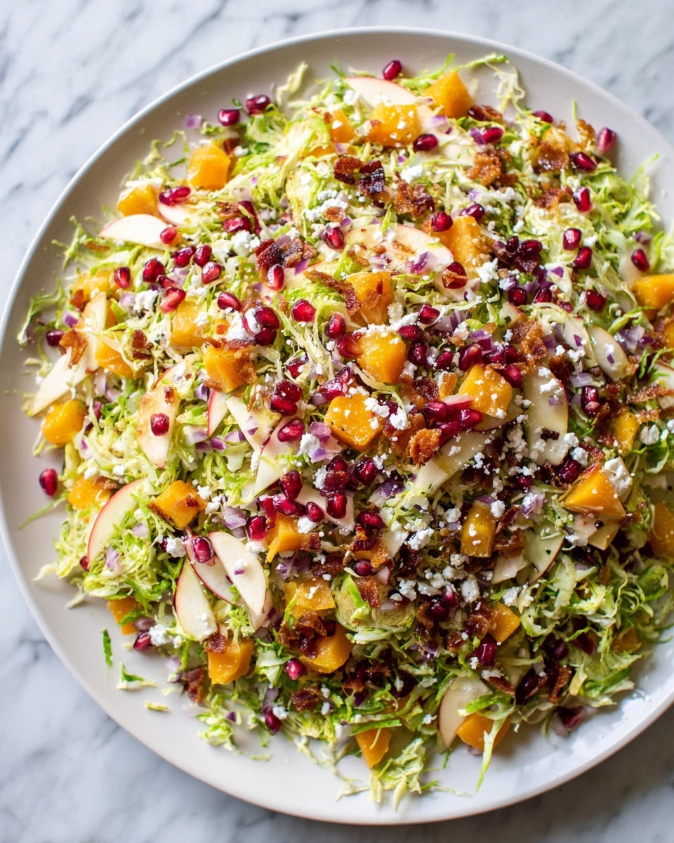 Chop the Brussels sprouts finely—shredded textures blend beautifully with the roasted squash. Dice the apple and red onion, then toss them into a large salad bowl along with the pomegranate arils, sliced almonds, crumbled feta, and once cooled, the roasted butternut squash and crispy bacon. This mix captures the essence of fall in every bite.